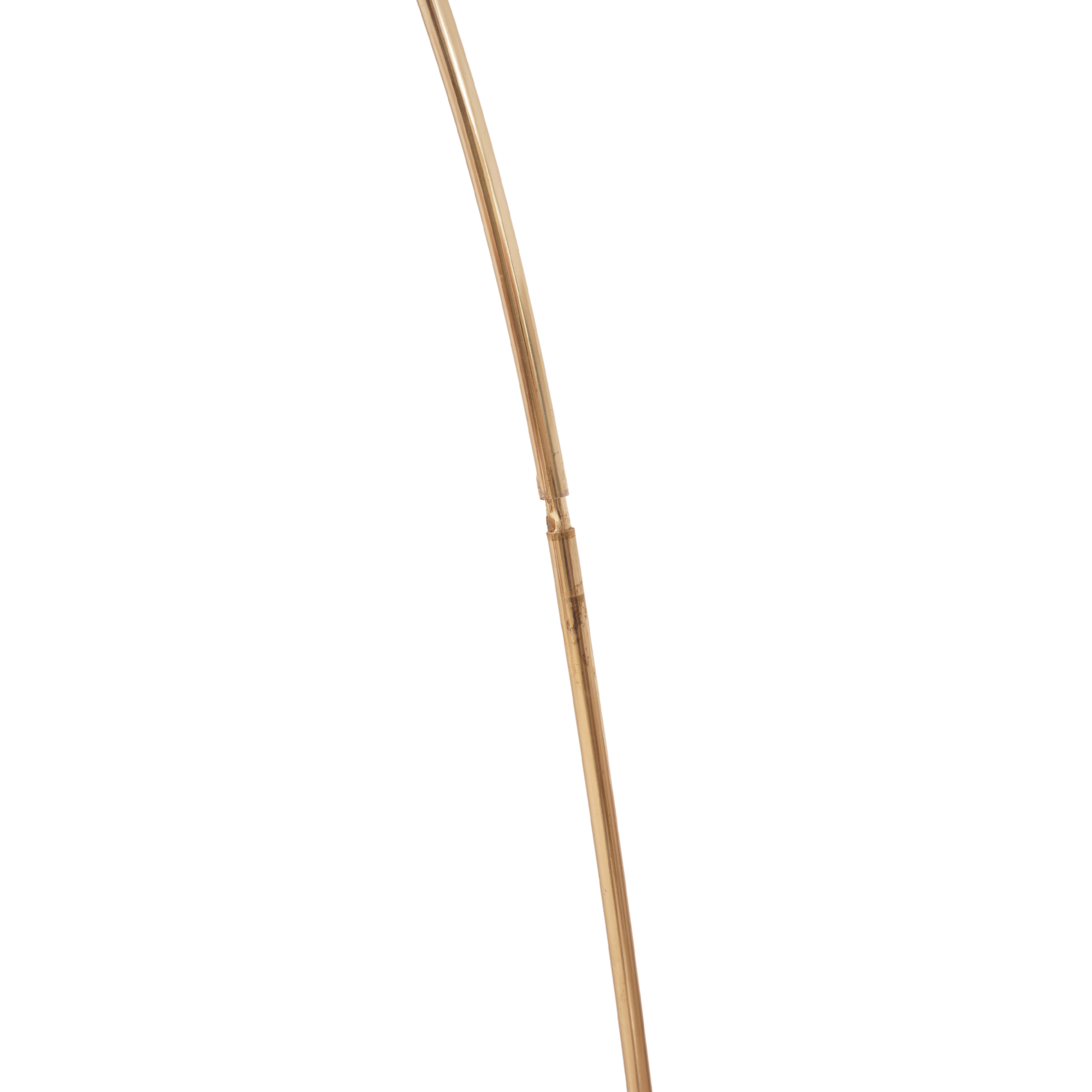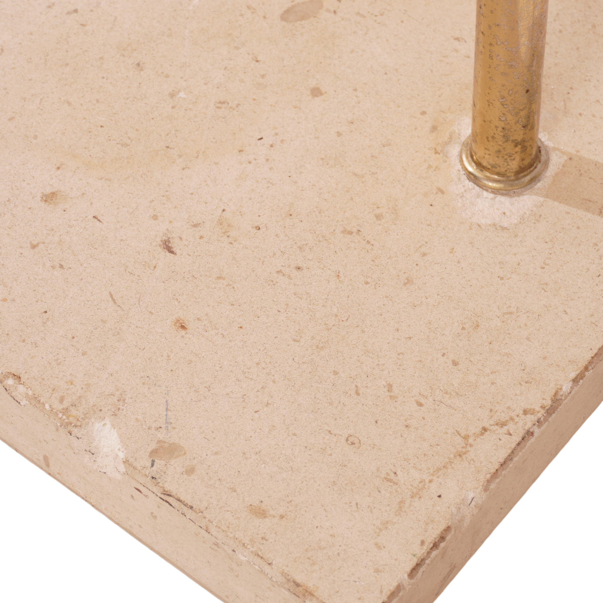 - 78"h, 9.75"w, 70.75"d- Travertine base, brass plated metal- Type A plug; accepts one standard base bulb- Condition: Excellent; some wear and patina to brass finish and base