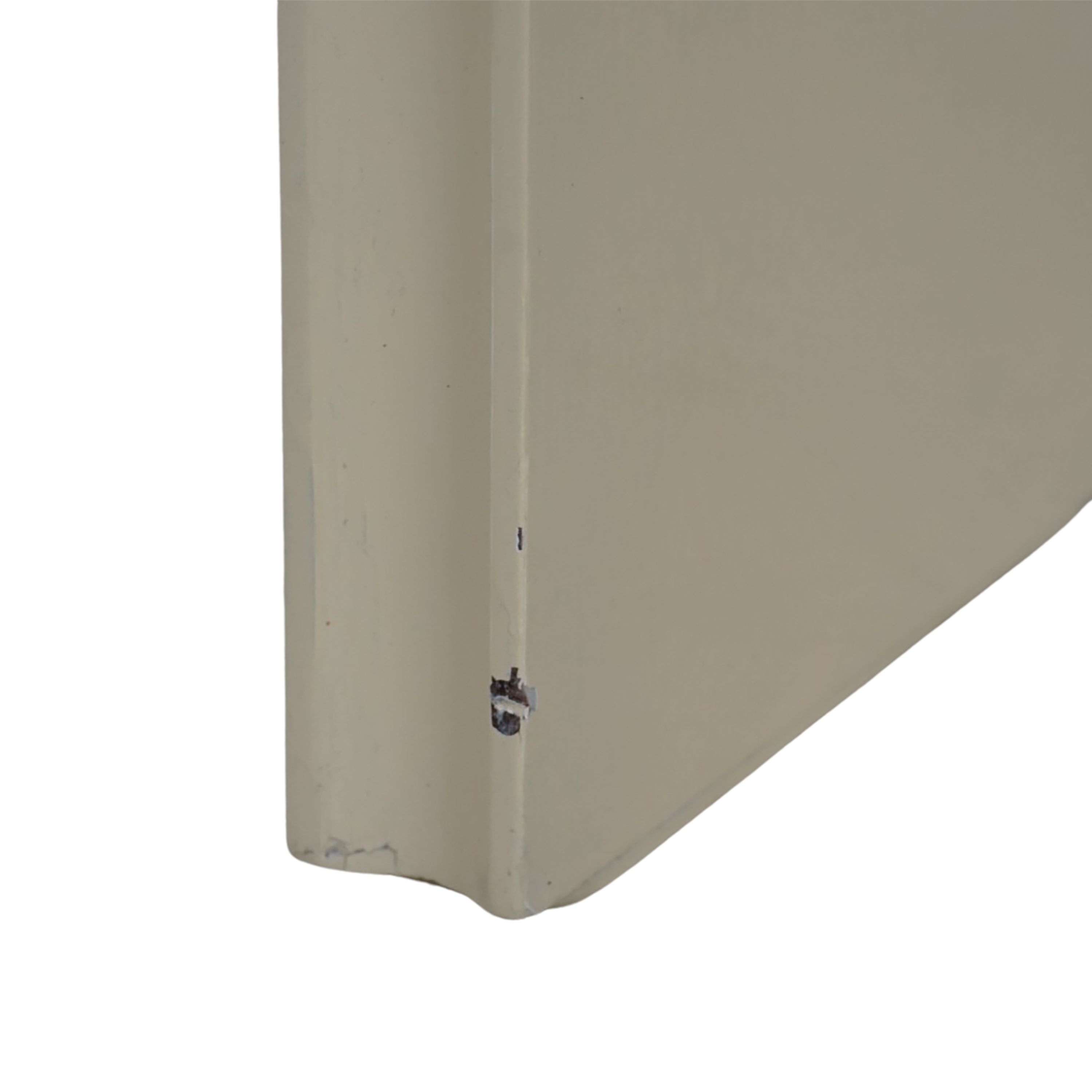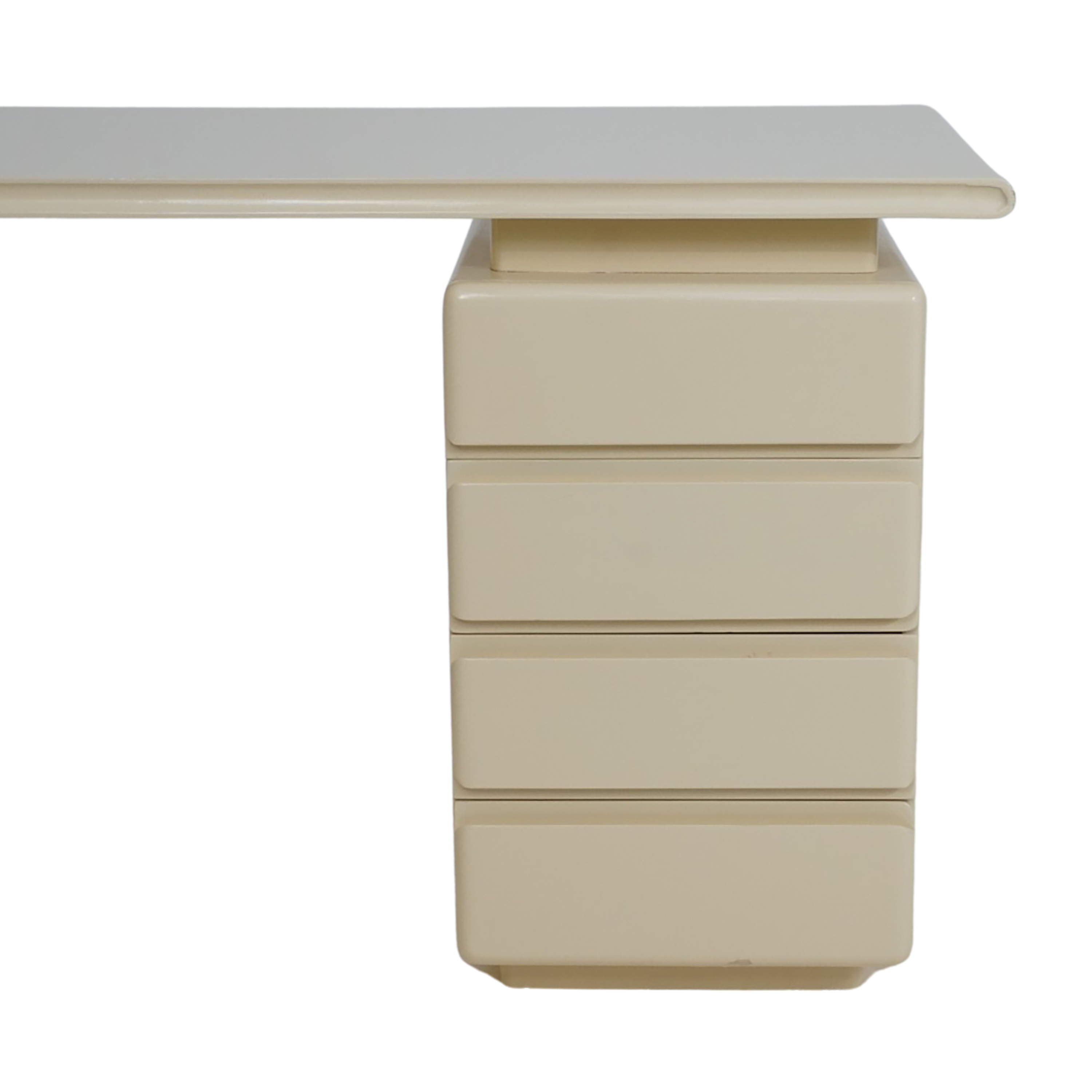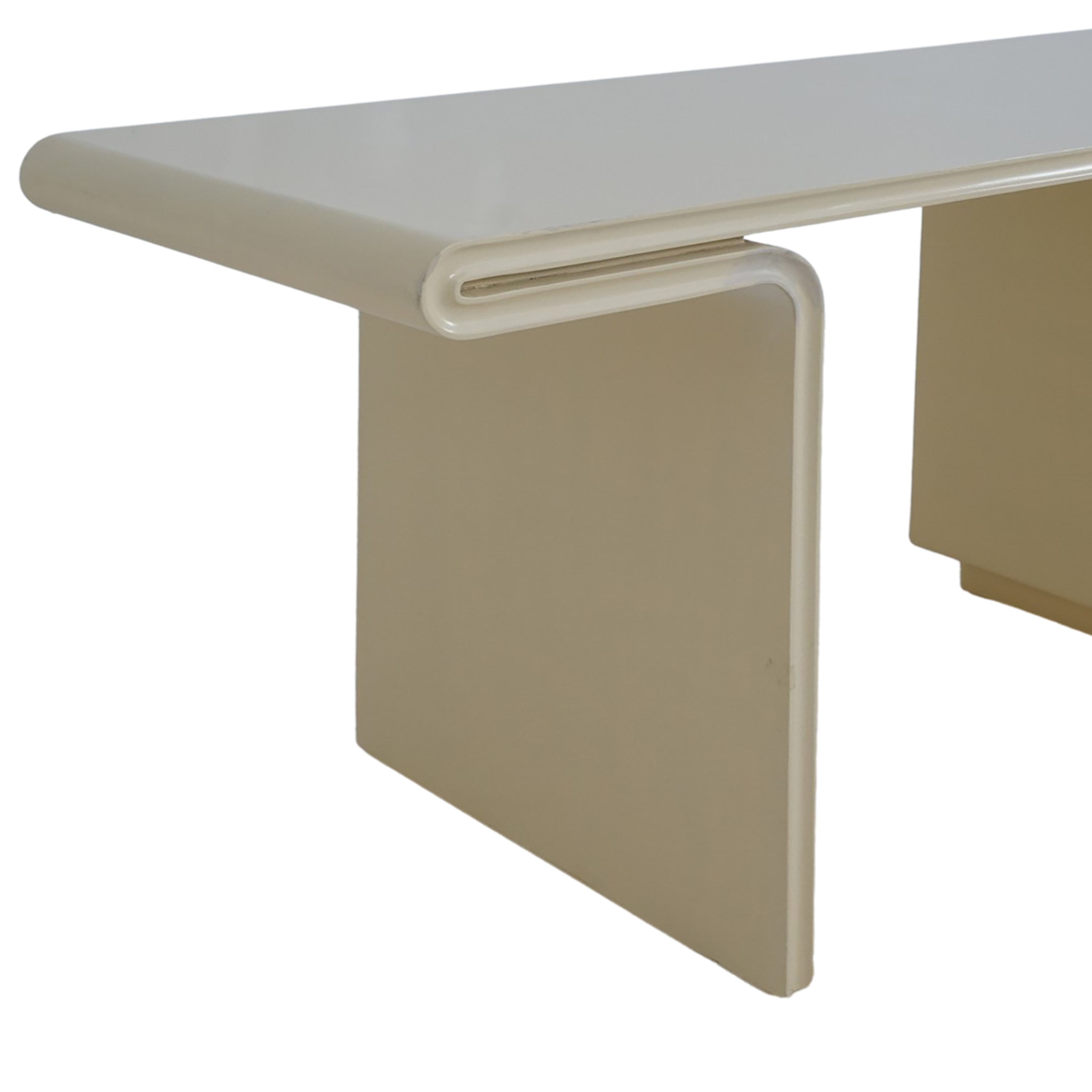 - 28.75"h, 63.5"w, 23.5"d, 27.75" leg clearance- Cream lacquered wood- Condition: Excellent; a few minor nicks to edges; bonded at curved parts