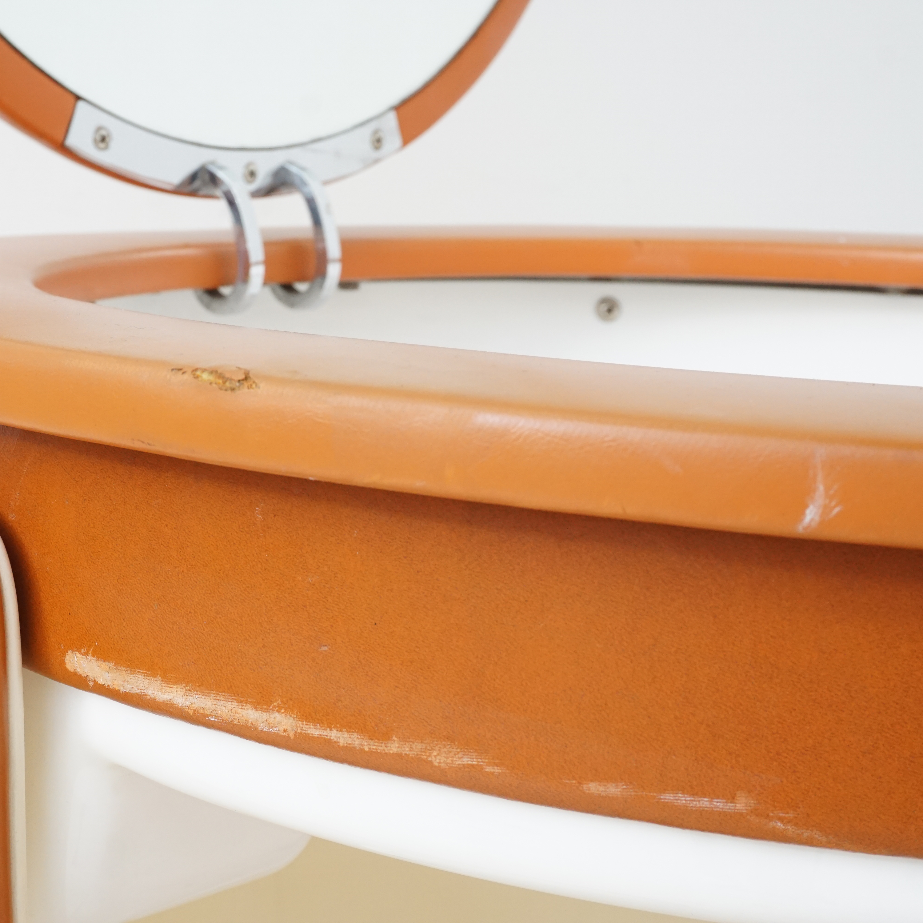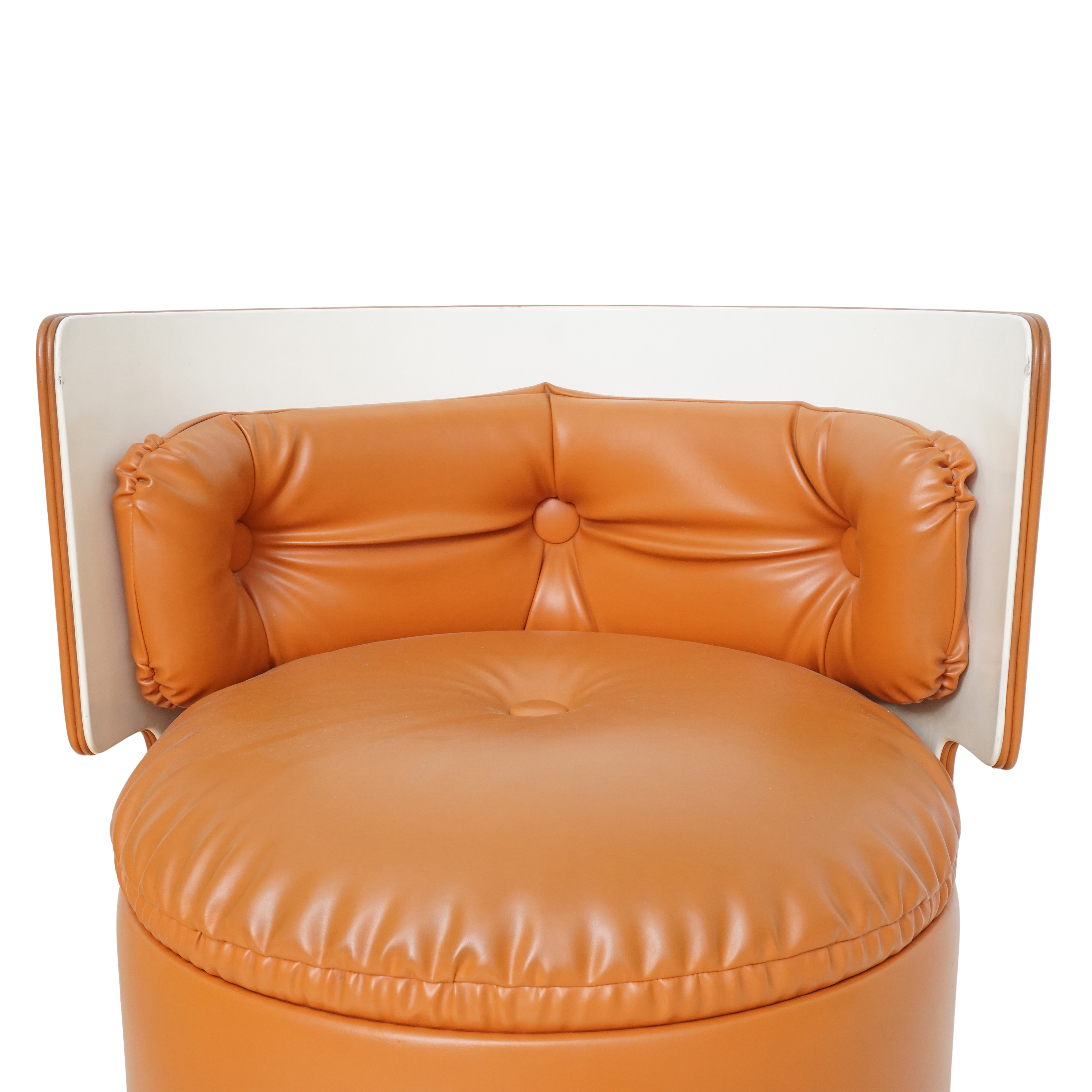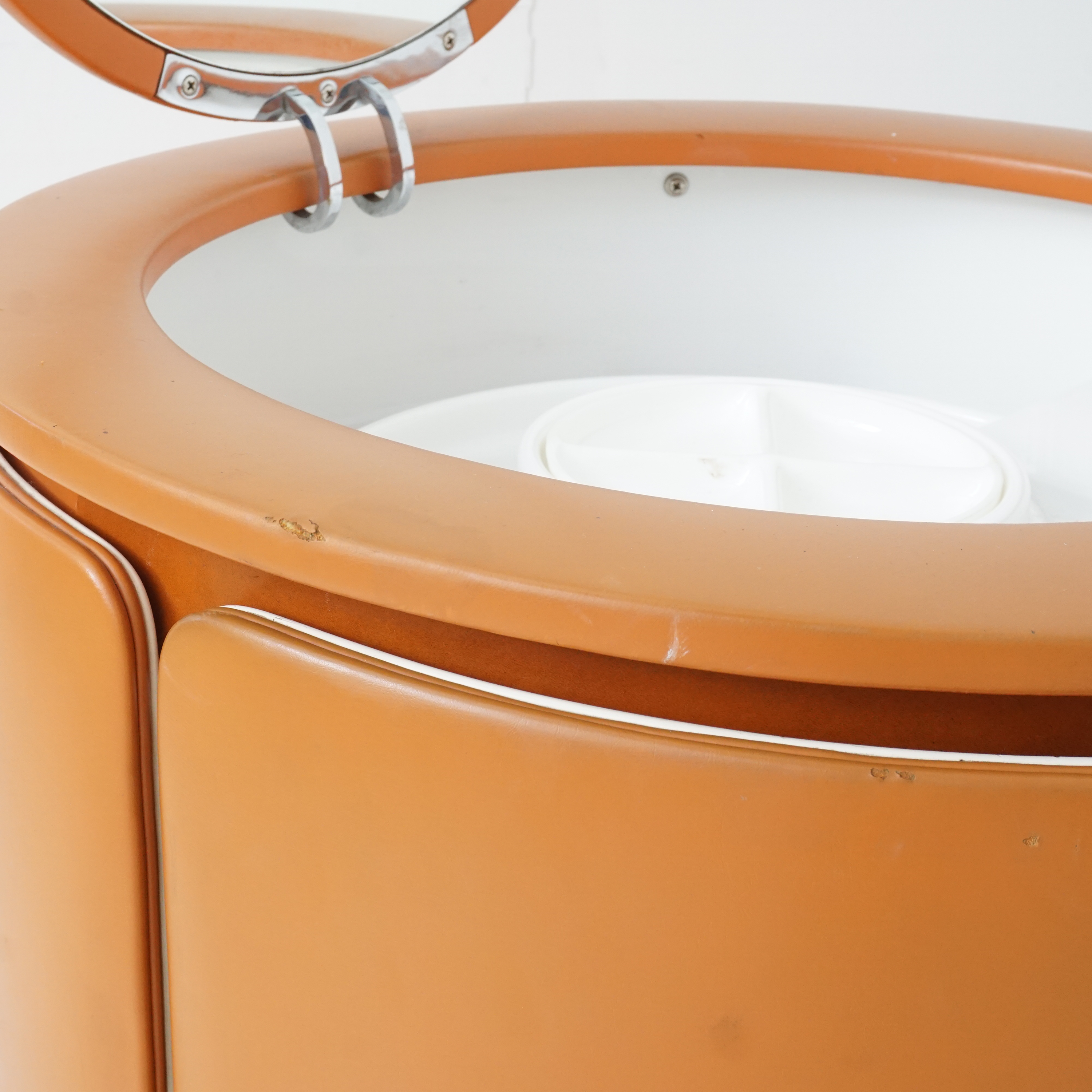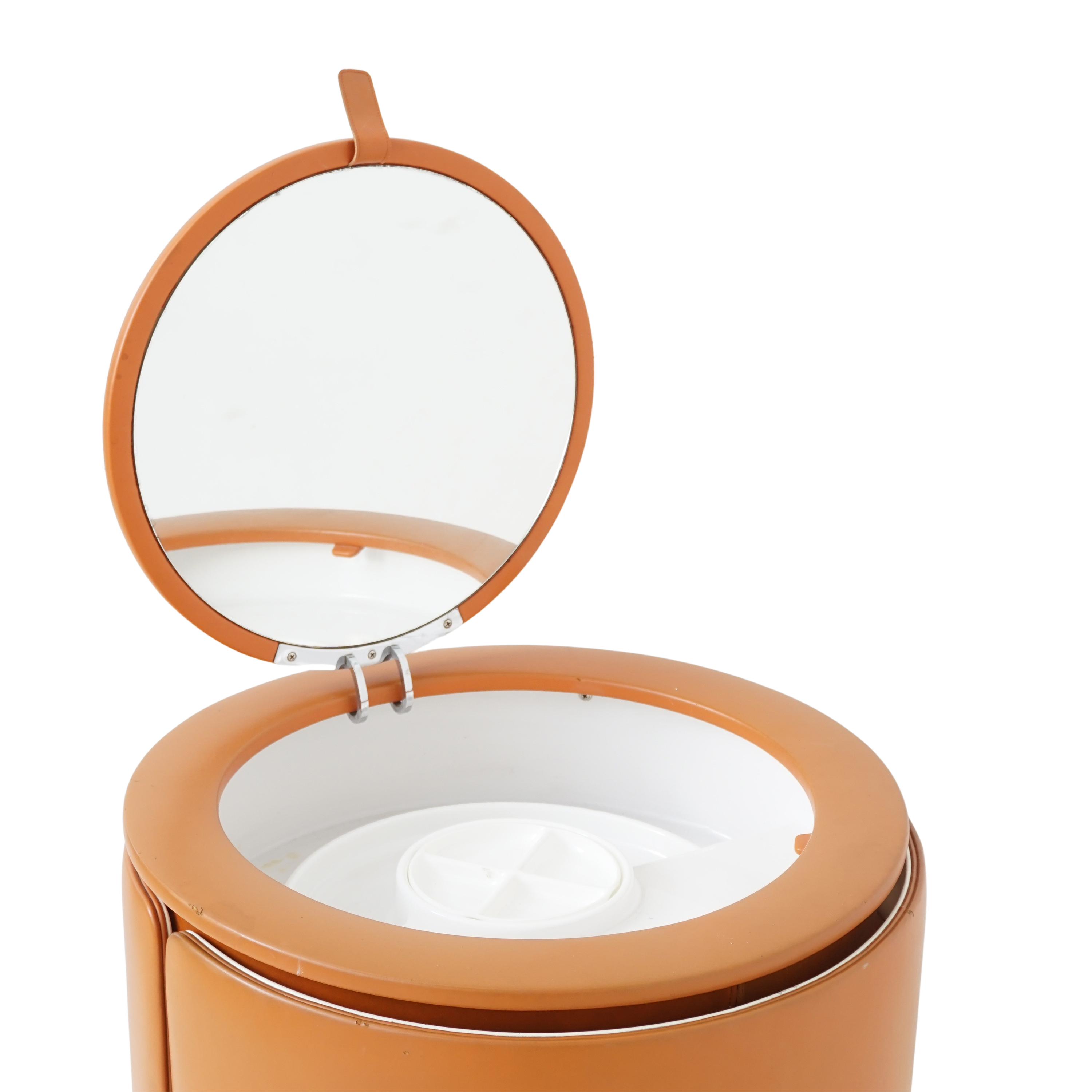 A rare and iconic piece of Italian modern design, the Dilly Dilly vanity by Luigi Massoni for Poltrona Frau combines sculptural form with compact function. Designed in the 1960s, it features a rotating cylindrical base that opens to reveal a vanity with a flip-top mirror and integrated storage, plus a matching upholstered chair that nests seamlessly inside.