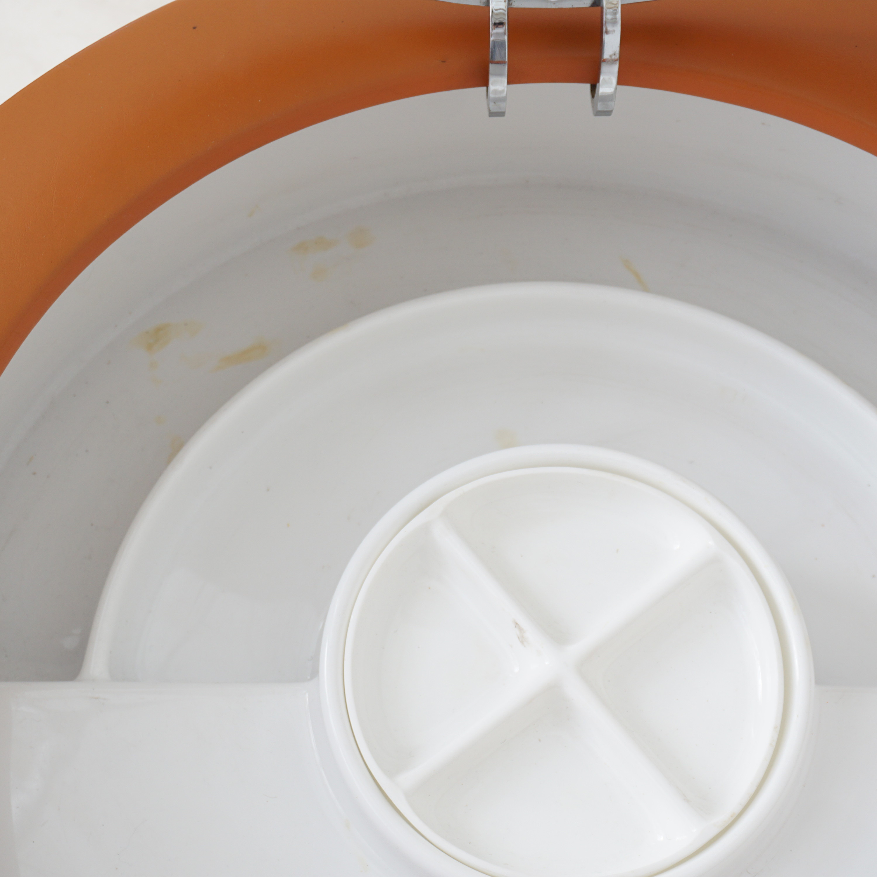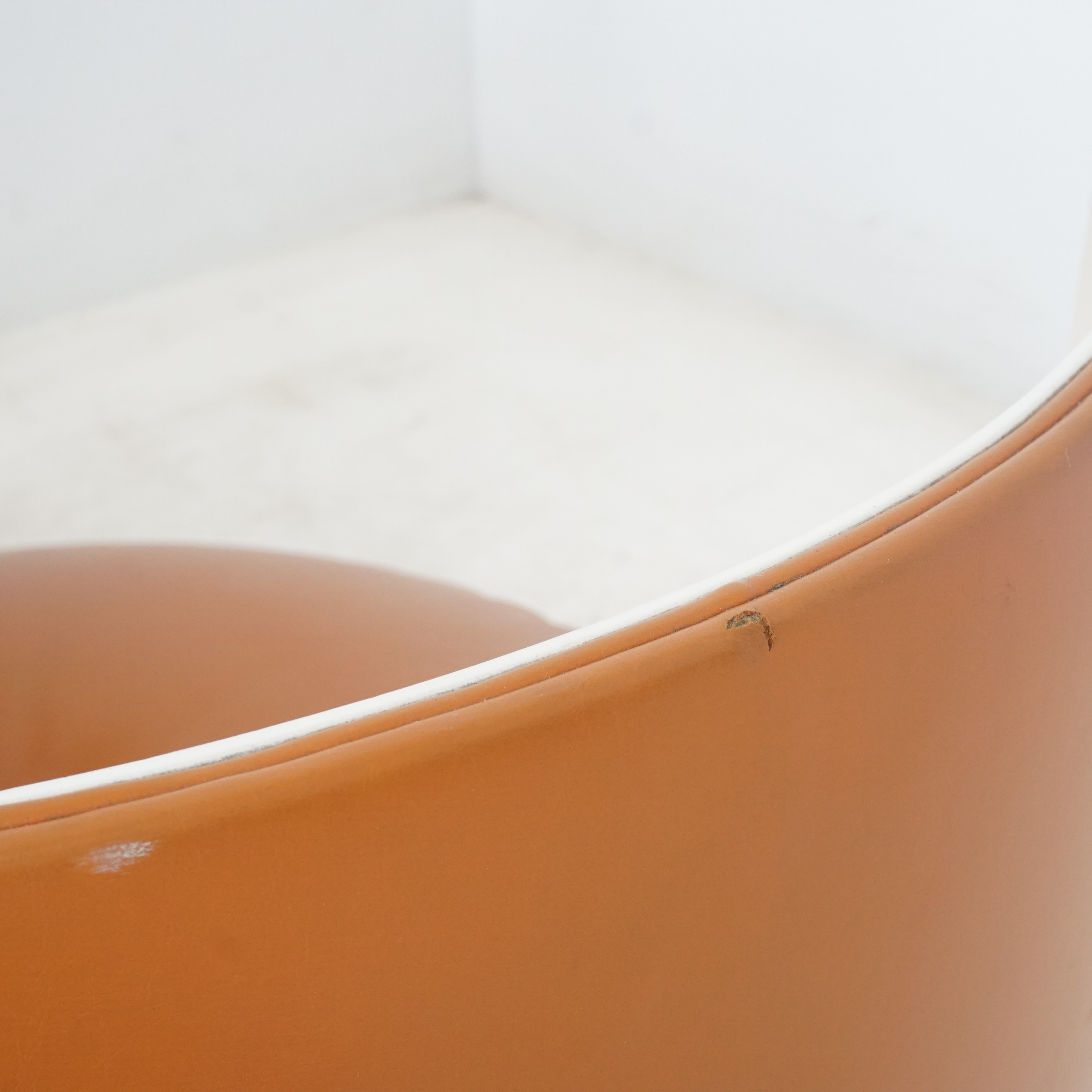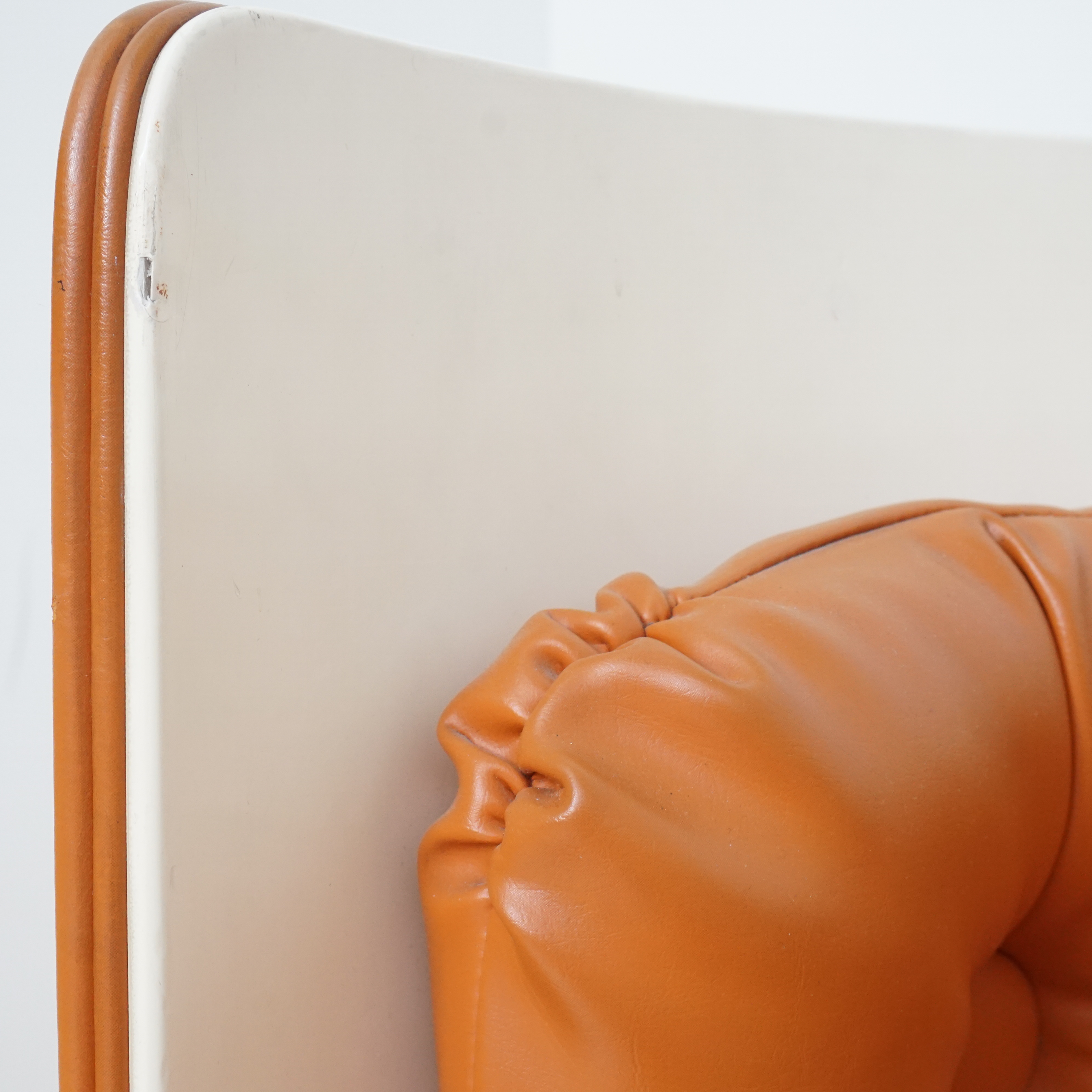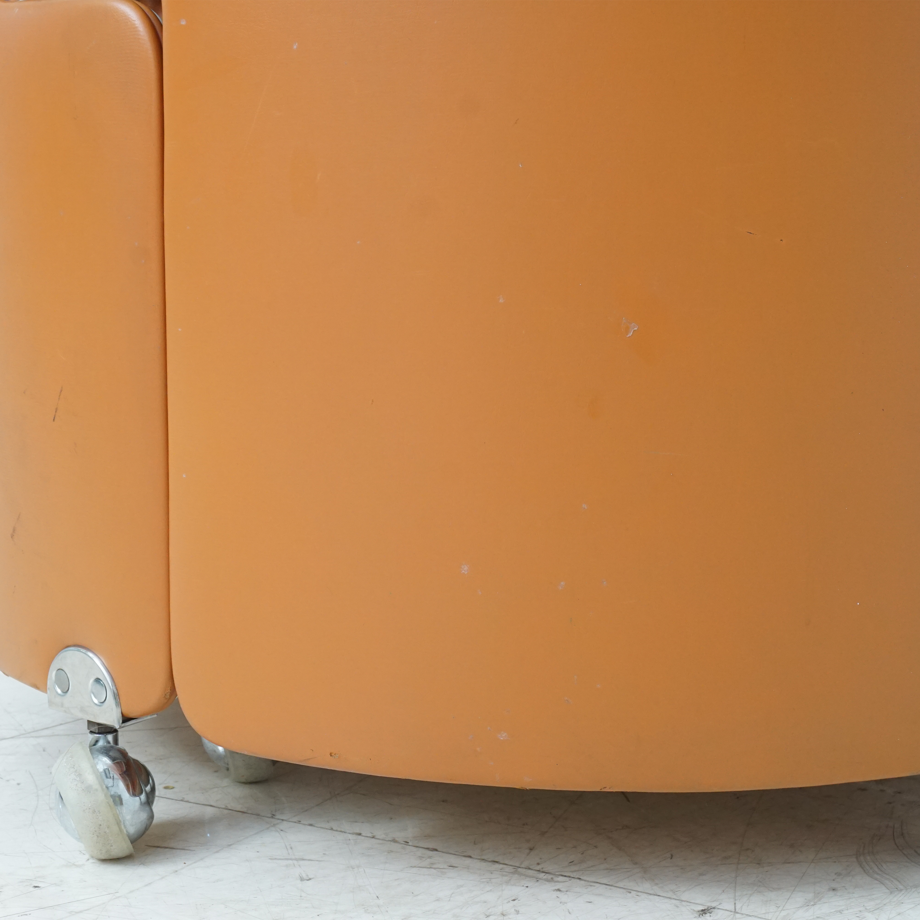 A rare and iconic piece of Italian modern design, the Dilly Dilly vanity by Luigi Massoni for Poltrona Frau combines sculptural form with compact function. Designed in the 1960s, it features a rotating cylindrical base that opens to reveal a vanity with a flip-top mirror and integrated storage, plus a matching upholstered chair that nests seamlessly inside.